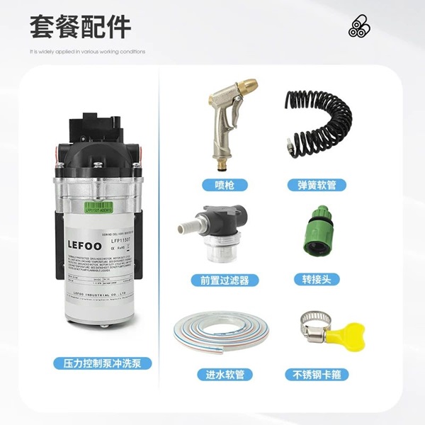 壓力控制泵套件包括壓力控制泵一臺、便攜式噴槍一把(金屬噴槍)、轉接頭兩只(三分內插轉外螺紋)、一副彈簧軟管10*6.5套件(軟管長度5米,一端帶不銹鋼轉接頭,一端帶快接接頭)、80目前置過濾器(帶三分外螺紋轉寶塔轉接頭)選配、進水軟管內徑12mm(長度2米)、2只不銹鋼卡箍。