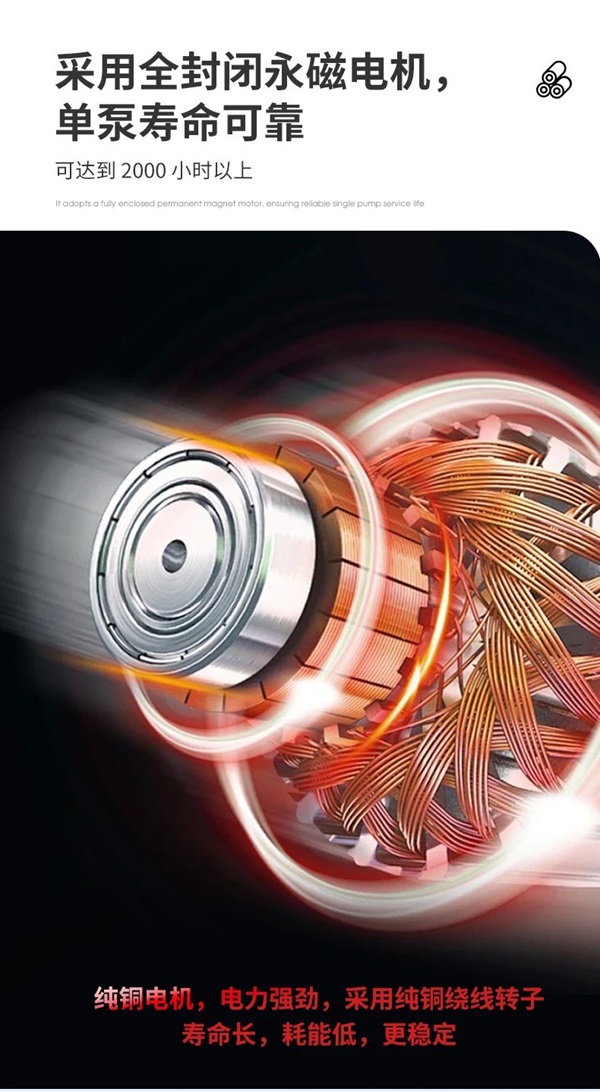 采用全封閉永磁電機,單泵壽命可靠,可達到2000小時以上