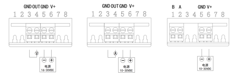 根據(jù)選型不同,下圖分別為電壓輸出、電流輸出、RS485輸出接線方式
